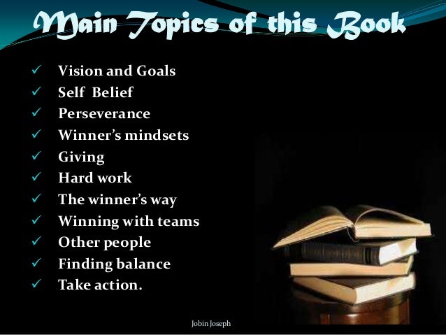It will help you to help others to rise their potential. Jobin Joseph • Main Topics of this Book Vision and Goals Self Belief Perseverance Winner’s mindsets Giving Hard work The winner’s way Winning with teams Other people Finding balance Take action. Jobin Joseph • Vision and Goals Set yourself a Goal and focus on it, If it is elusive change our tactics for achieving the goal. Avoid the complaining and take the training.